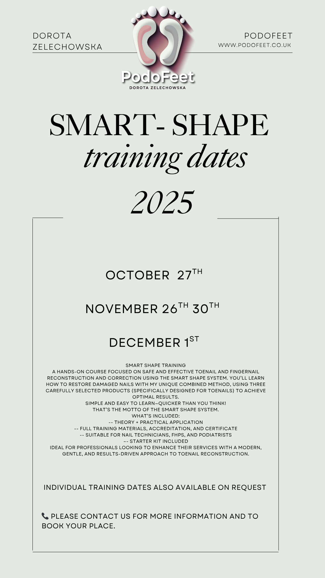 Upcoming dates for Smart Shape training sessions. Feel free to contact me for more details