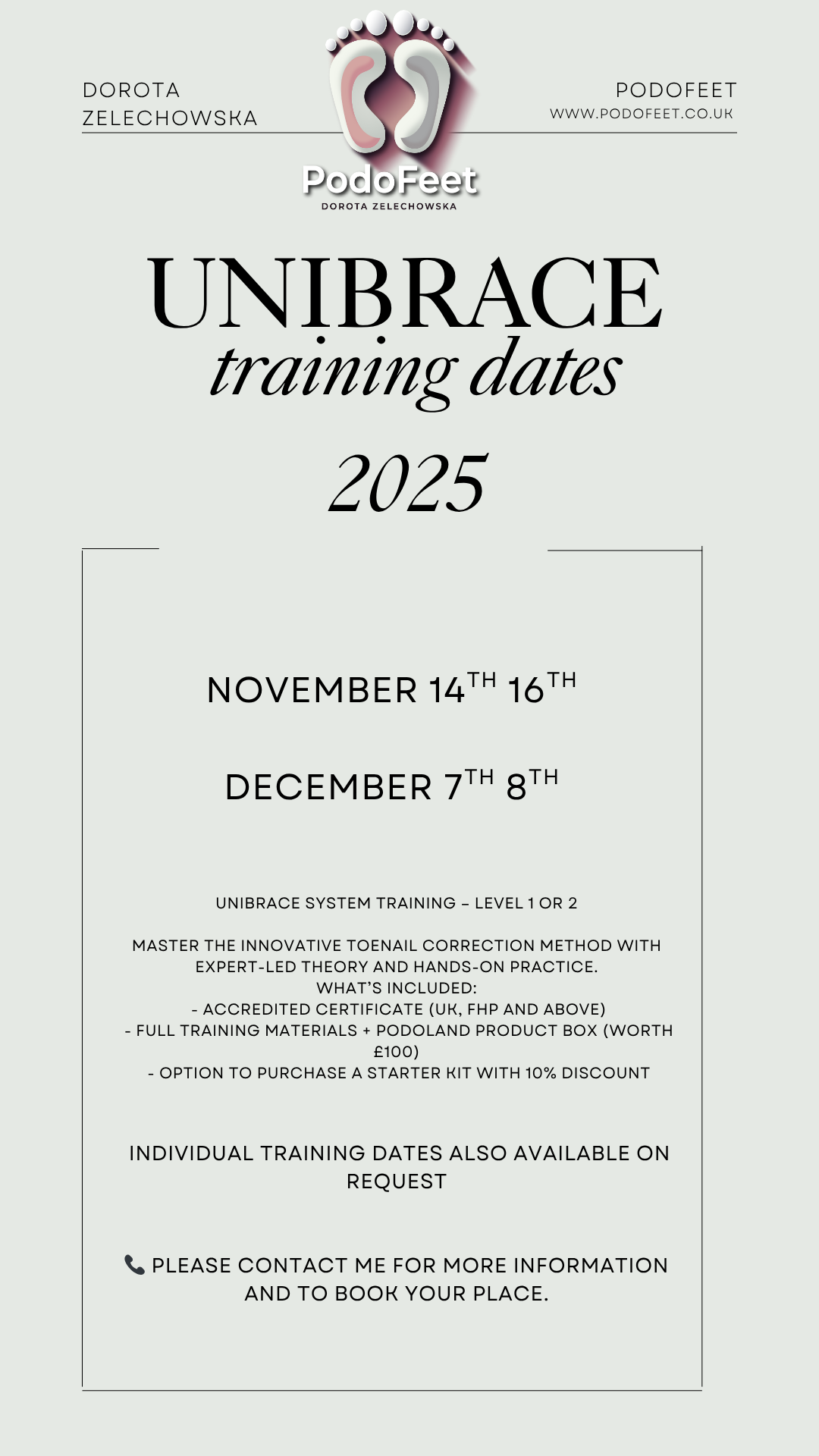 Upcoming dates for Level 1 and 2 Unibrace training sessions. Feel free to contact me for more details